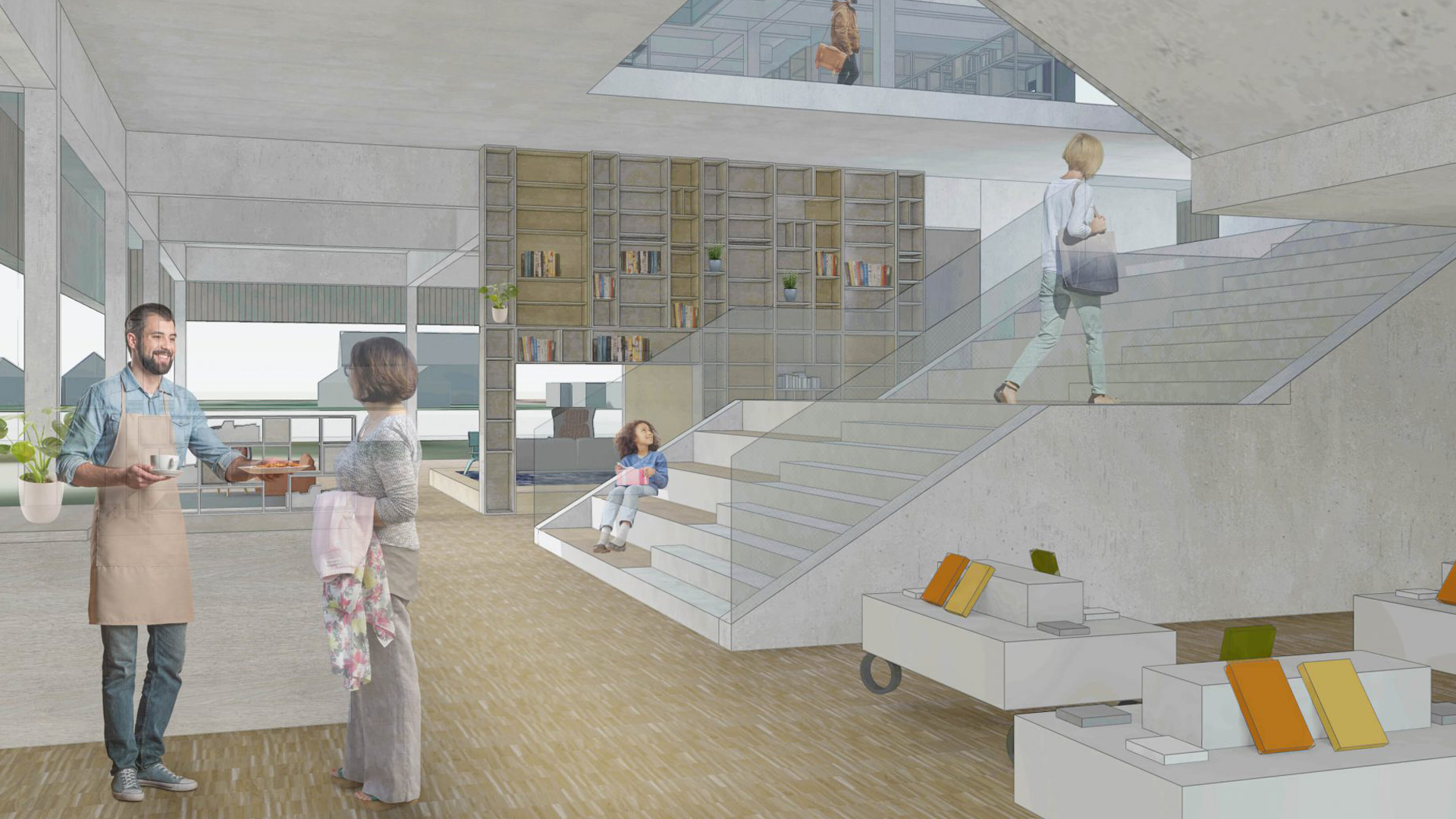 Während der vorläufige abstrakte Name “Bildungshaus” die politischen und administrativen Ursprünge der Idee widerspiegelt, steht für das Haus selbst viel auf dem Spiel. Hier wird keine Langweiligkeit erwartet: Das hybride Haus soll ein Schmelztiegel von Menschen, Erfahrungen, Fähigkeiten, Lernprozessen und Informationen werden. Diese sollen alle bei einer guten Tasse Kaffee im hauseigenen Café zusammenkommen und sich auf den verschiedenen Treppen, die das Split-Level-Design verbinden, vermischen.