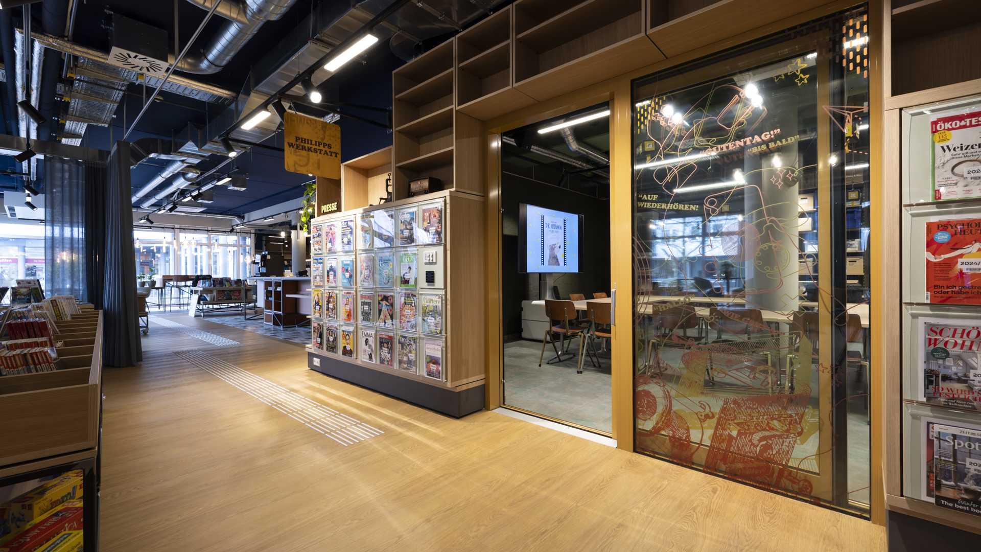 Durch den Umbau entstand aus dem früheren Geschäft und dem angrenzenden Restaurant eine vielseitige Bibliothek, die von includi mit einem Auge für Vielfalt und Inklusivität entworfen wurde. Obwohl die Bibliothek kompakt ist, überzeugt sie mit einem durchdachten Layout und mehreren Zonen, darunter ein gemütliches Lesecafé, ein Raum der Stille, ein inspirierenden Makerspace und ein stimmungsvoller Kinderbereich mit Bühne und Sitzplätzen in Amphitheater-Form. Das farbenfrohe Interieur verbindet den gemütlichen Dorfcharakter von Friedrichsdorf mit seinen Fachwerkhäusern und Höfen mit urbanen Akzenten.