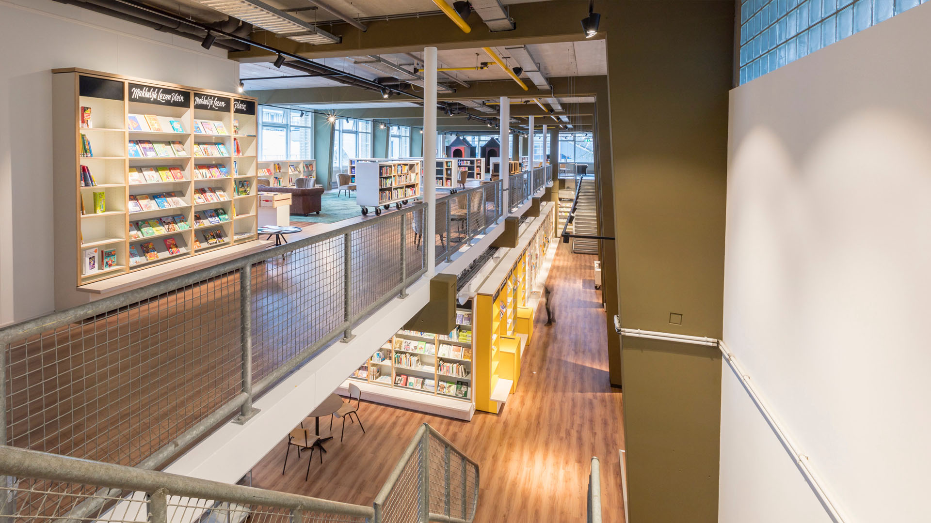 Als je ze niet kunt verslaan, sluit je dan bij ze aan! In Capelle bleek dat de nieuwe bestemming, een hoog gebouw met een industriële uitstraling, meer schoonheid bevatte dan gedacht. Door lichte kleuren toe te voegen en de robuuste constructie te benadrukken, werd de aantrekkingskracht van de ruimte extra zichtbaar. De hoogte is geaccentueerd dankzij een spannende gelaagdheid. Hier kunnen mensen comfortabel achterin de ruimte gaan zitten – wat zorgt voor ‘een waterval van gezichten’ die bezoekers verwelkomt zodra ze via de voorzijde van de bibliotheek binnenkomen.
