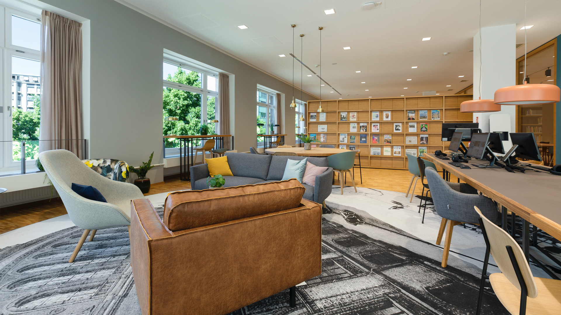 De bibliotheek biedt verschillende plekken om te zitten, te ontspannen en na te denken over de betekenis van herinneringen. Een ontmoetings- en informatiepunt met een grote gemeenschappelijke tafel bevindt zich in het midden van de bibliotheek. Deze centrale ruimte wordt omringd door individuele en groepswerkplekken met een kleine koffiebar. Aantrekkelijke werkplekken zijn ook langs de raamgevel opgesteld. Hier kan elke bezoeker een plek vinden om te lezen, te onderzoeken en om het opgedane te laten bezinken. In de cocoons en veel van het zitmeubilair is leder verwerkt. Dit natuurlijke materiaal herinnert eraan dat er momenten in de geschiedenis zijn die zichtbare sporen achterlaten.