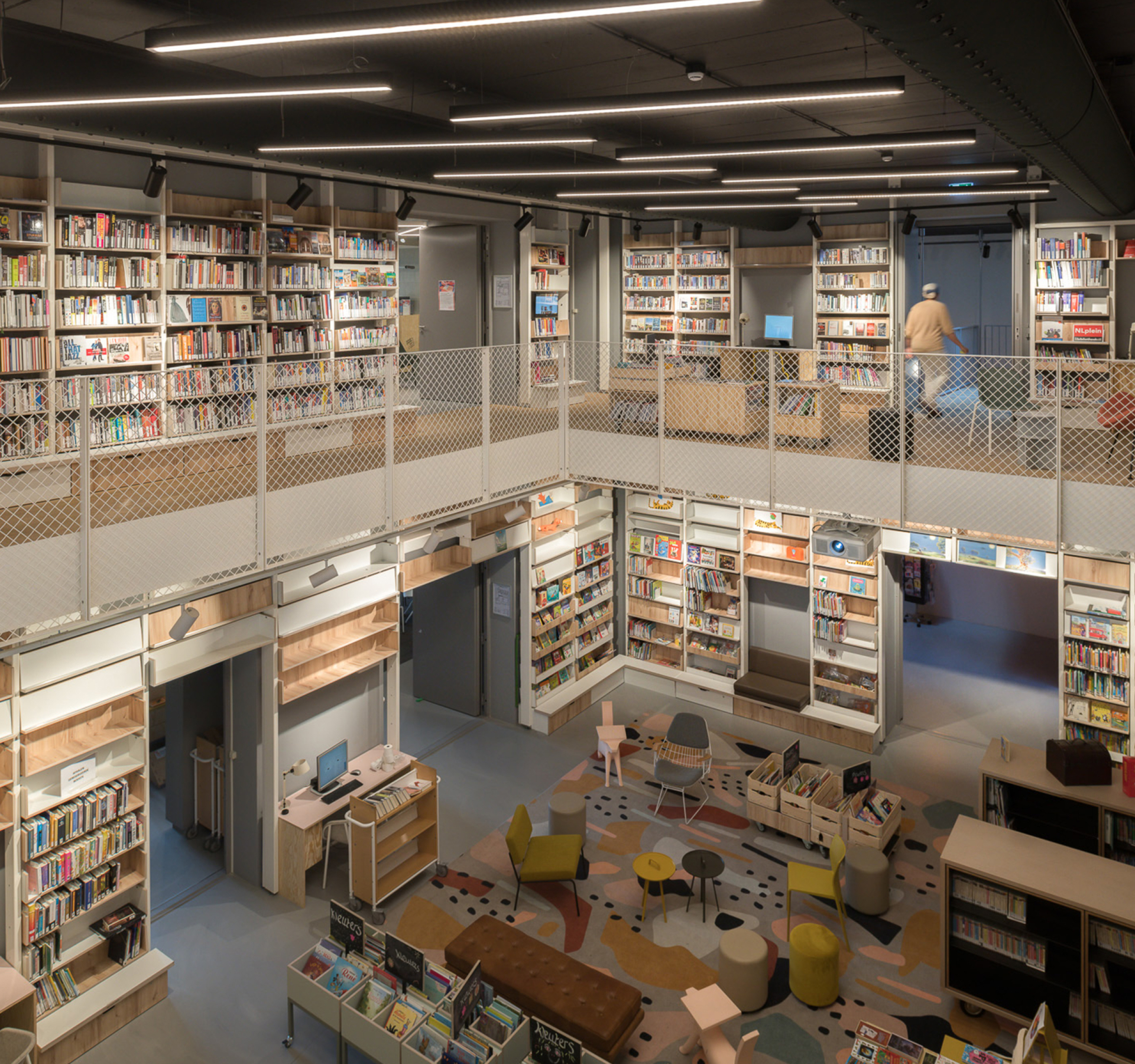 Conceptueel is de openbare ruimte als uitgangspunt genomen, geïllustreerd door het laagdrempelige buurtrestaurant dat als plein is ontworpen. In de geest van inclusie zijn deze ruimtes multifunctioneel ontworpen en uitnodigend voor alle leeftijdsgroepen. Er is een kleine theaterzaal op de begane grond, die ook dienst doet als jeugdafdeling van de bibliotheek en gevuld kan worden met boeken. Op de bovenverdieping zijn er verschillende zitplekken om te lezen, te ontspannen en te werken, evenals een openbare makerspace met verschillende workshops. Op de begane grond fungeert de foyer als ontvangstruimte en theaterfoyer met buitenterras. Het overdekte ‘plein’ is voorzien van tafels en zitjes, en nodigt bezoekers uit om te blijven hangen, of ze nu aan de grote leestafel zitten met een boek of genieten van een drankje en een hapje.