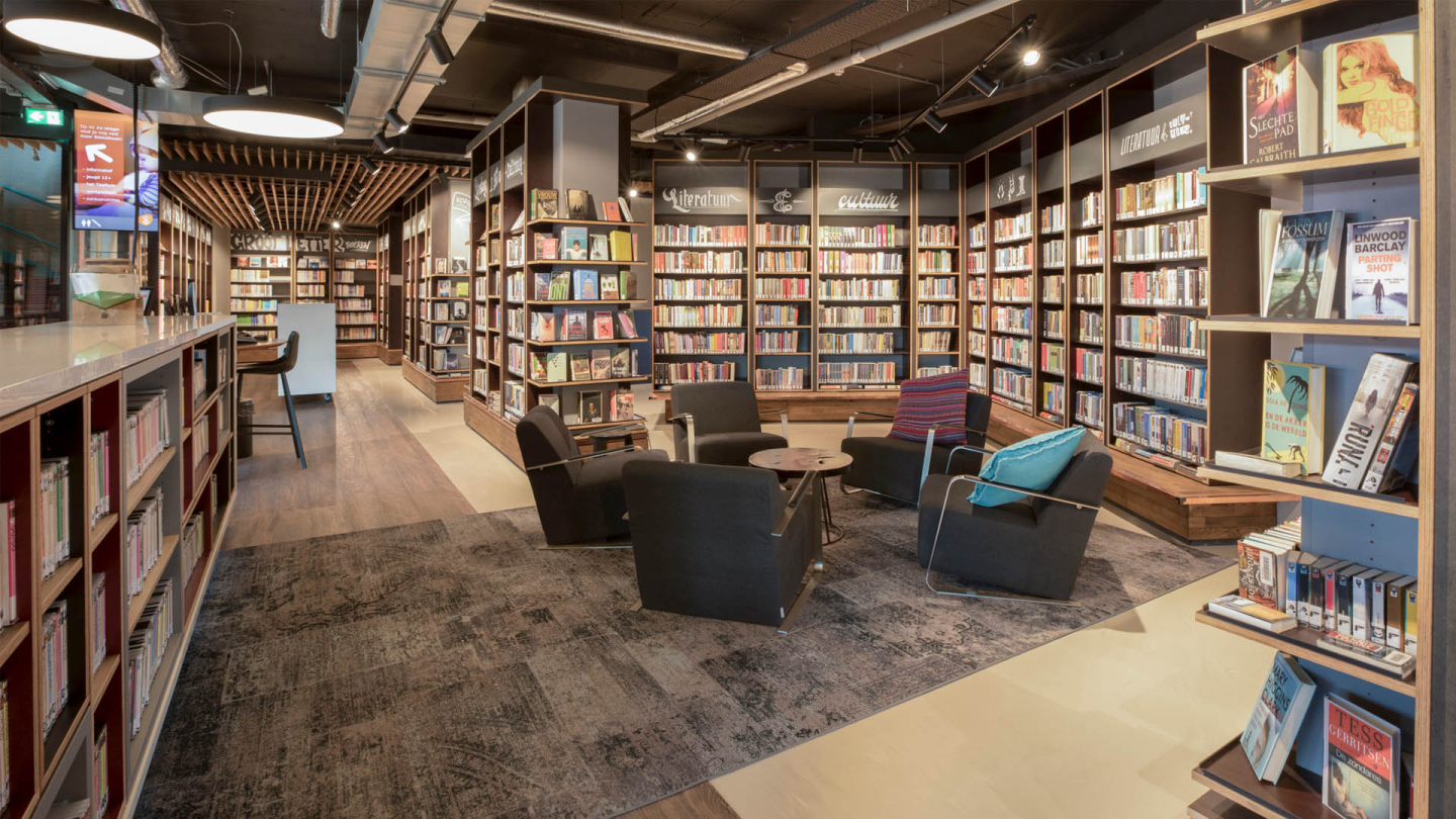 Books and new media are available in varied compositions. The fresh and colorful interior offers corners with an ambiance of their own, complete with large sofas and cozy seats. The space is small yet open, light, transparent and flexible thanks to mobile book racks. Wooden elements add warmth and varying heights in the ceiling with wooden laminations add playfulness.