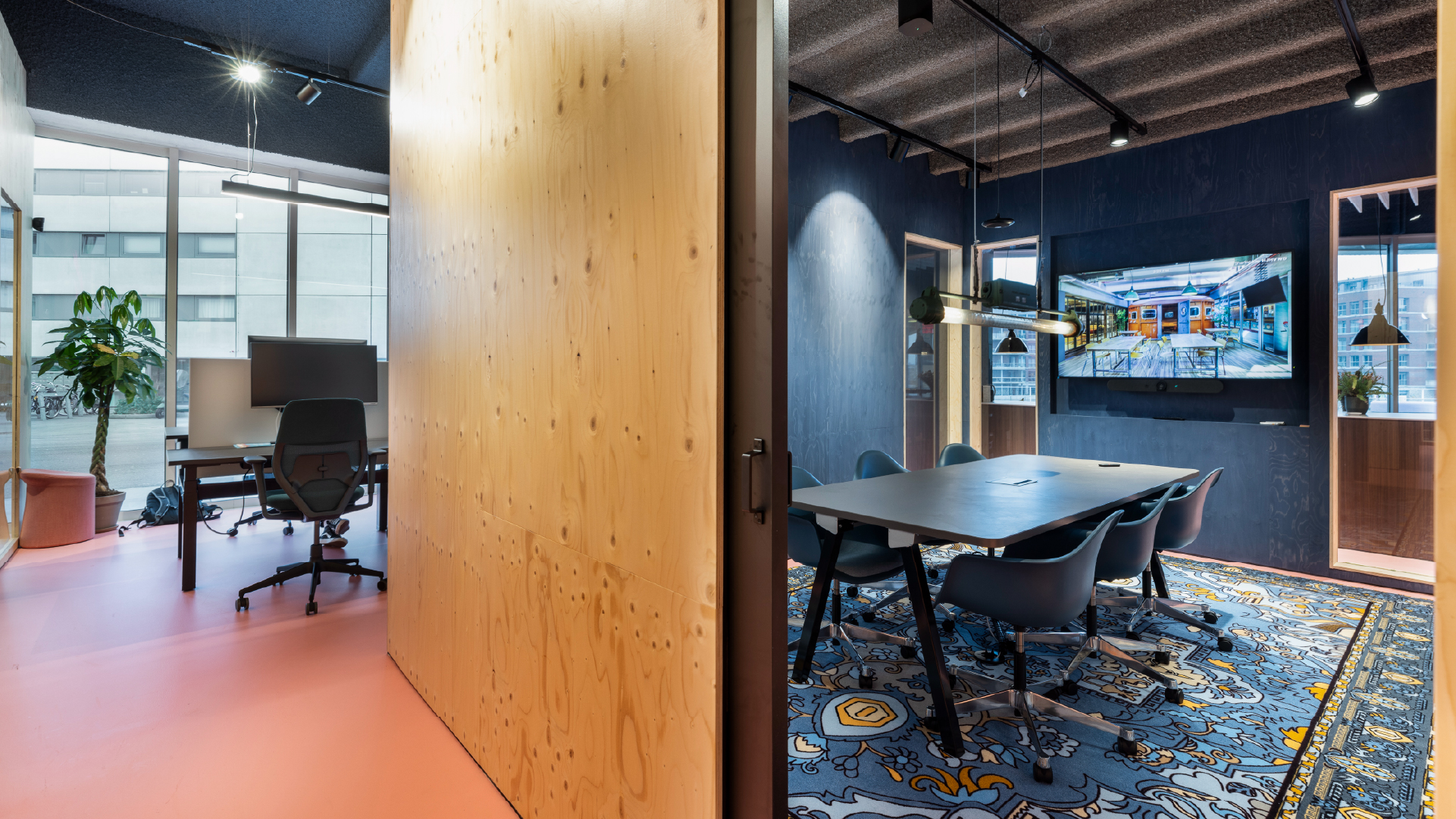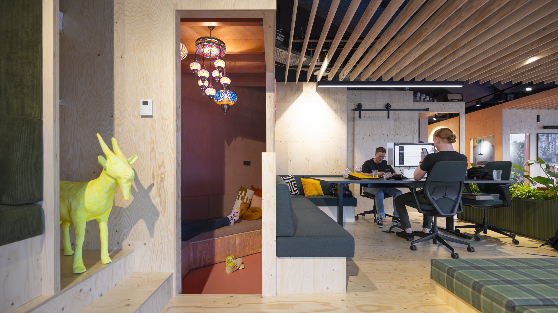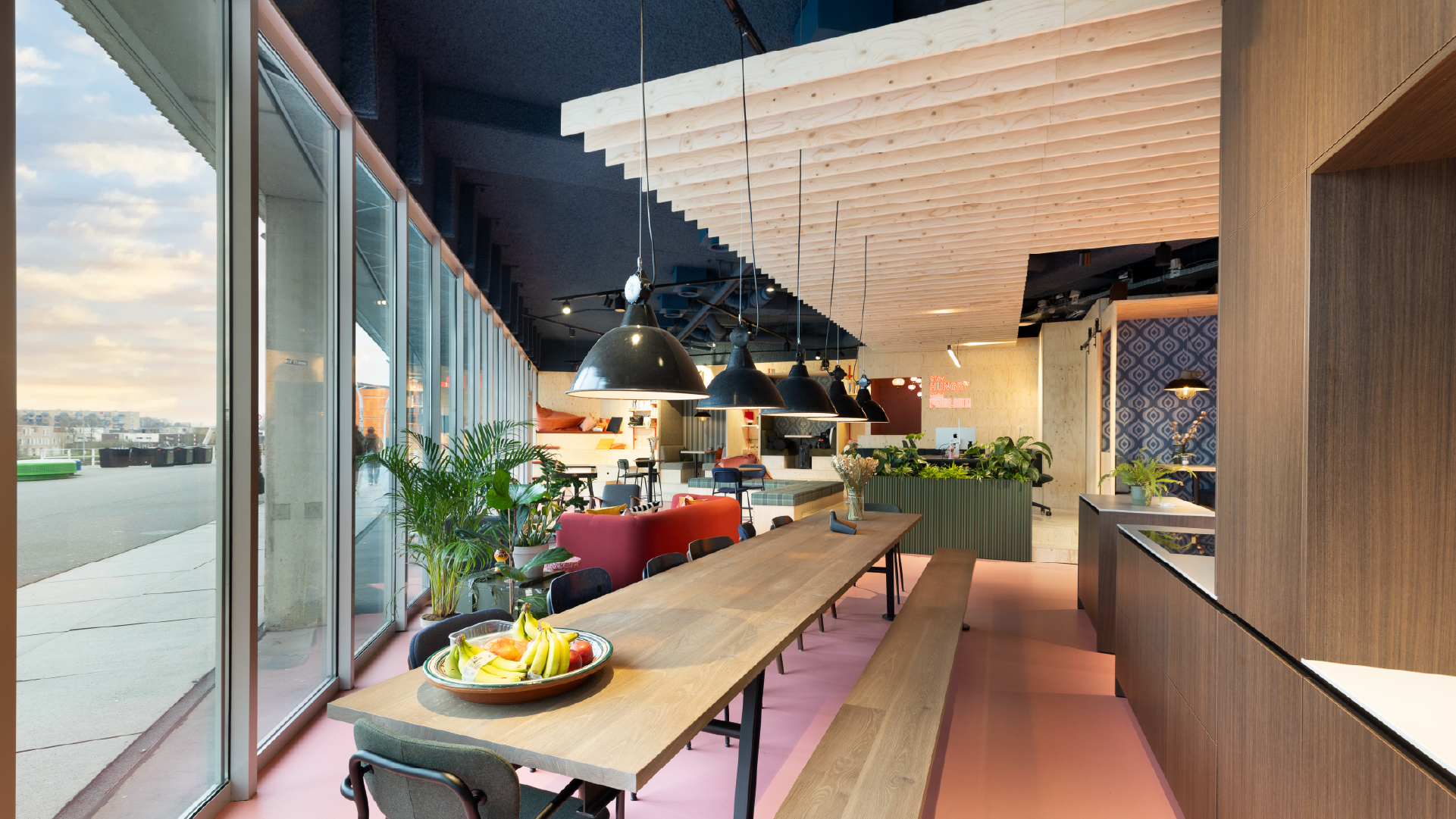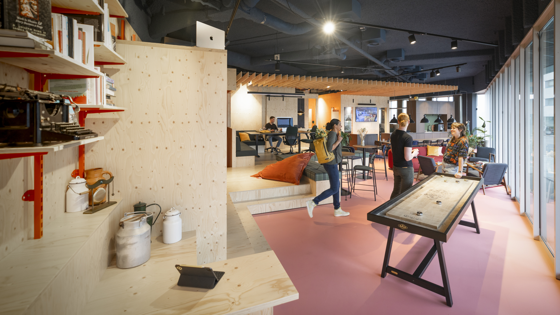 Everyone agreed: our new workspace had to match our DNA. By mapping all our needs, the idea of an office space as a landscape, a familiar village overlooking the big city, equipped with enough places for rest and relaxation, was born. “From various disciplines within our team there was active thinking. Together we made choices in terms of materials, colors and design to create a warm look and feel. Our graphic experts designed the patterns for the carpets, as well as a custom shuffleboard. In addition, everyone rolled up their sleeves to paint, stain and sand. This involvement truly makes our office a place of, by and for us,” explains Interior Designer Kaylee Hartman, responsible for the design and technical execution.