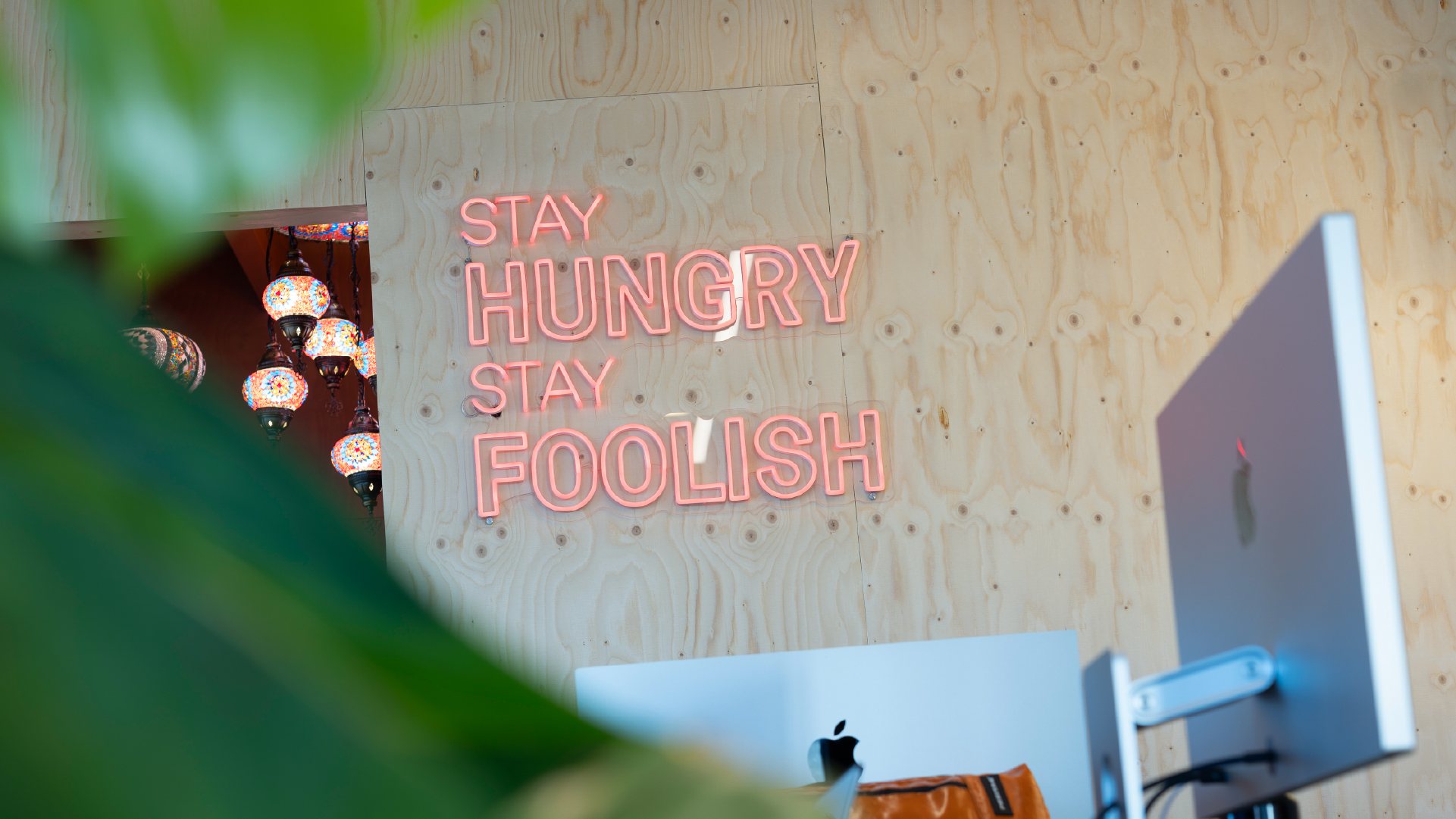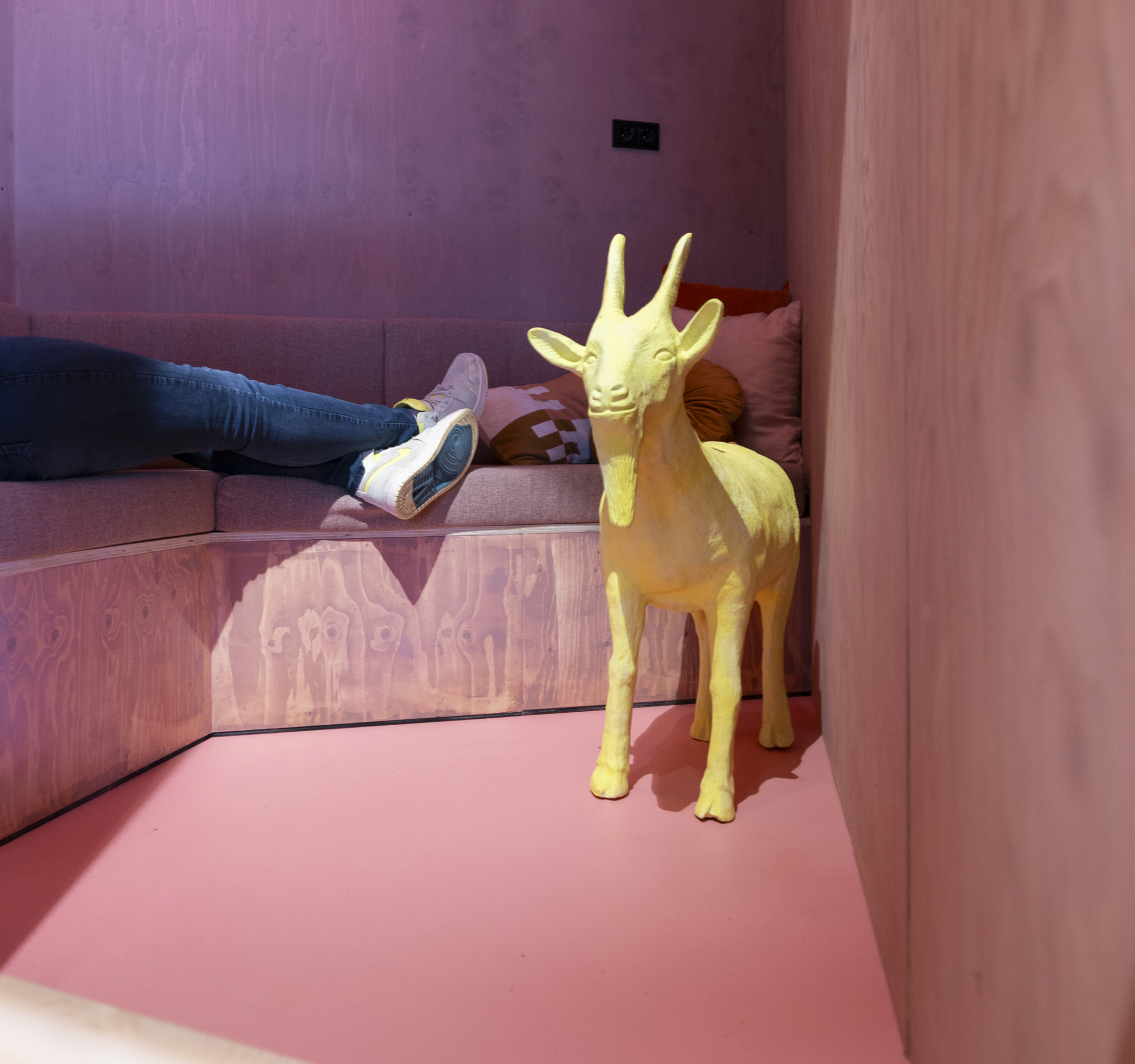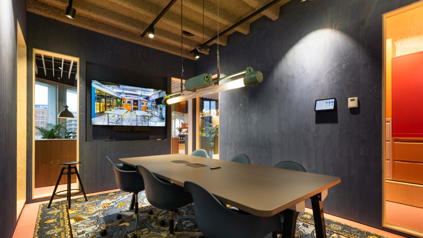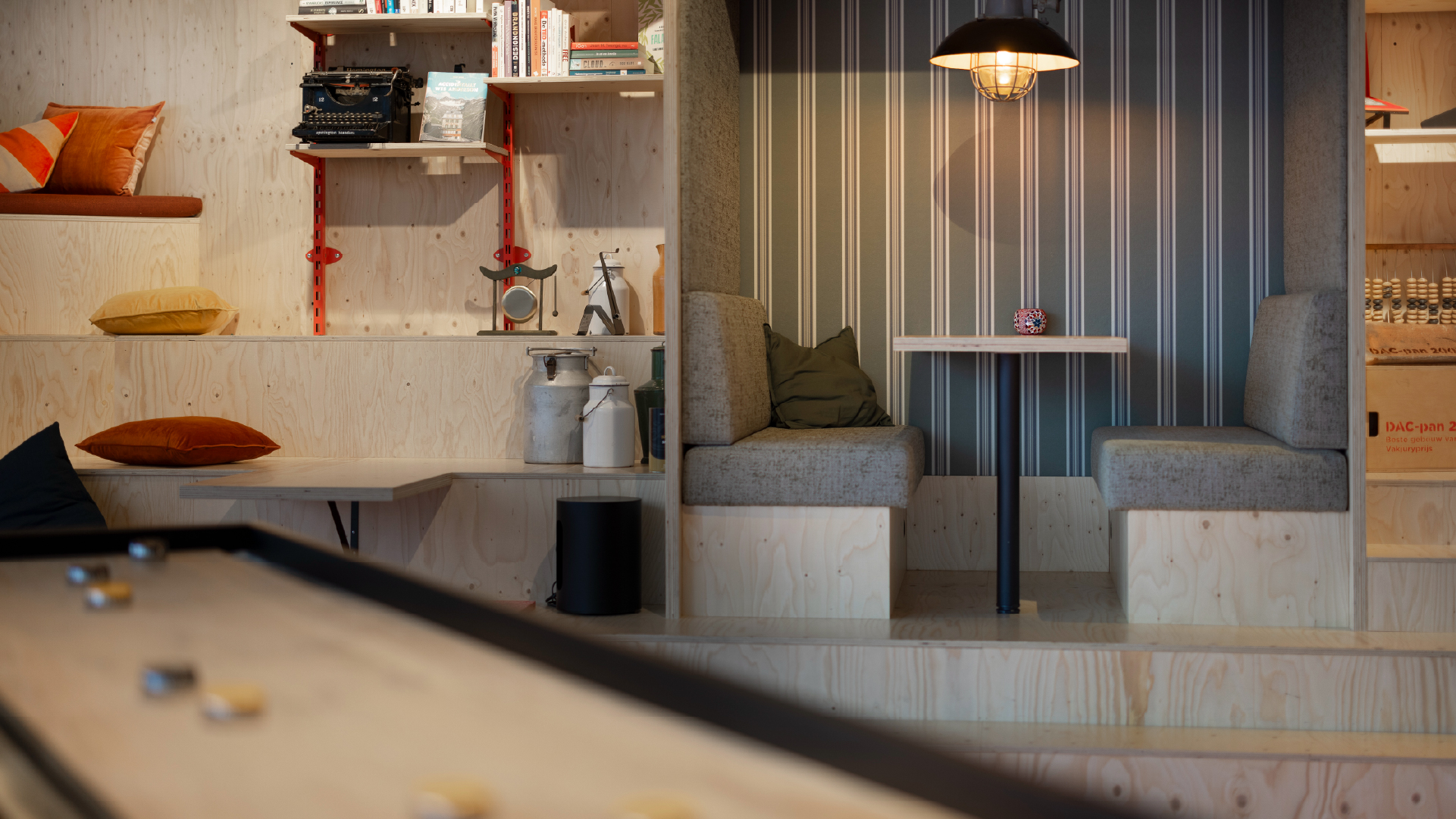 Everyone agreed: our new workspace had to match our DNA. By mapping all our needs, the idea of an office space as a landscape, a familiar village overlooking the big city, equipped with enough places for rest and relaxation, was born. “From various disciplines within our team there was active thinking. Together we made choices in terms of materials, colors and design to create a warm look and feel. Our graphic experts designed the patterns for the carpets, as well as a custom shuffleboard. In addition, everyone rolled up their sleeves to paint, stain and sand. This involvement truly makes our office a place of, by and for us,” explains Interior Designer Kaylee Hartman, responsible for the design and technical execution.