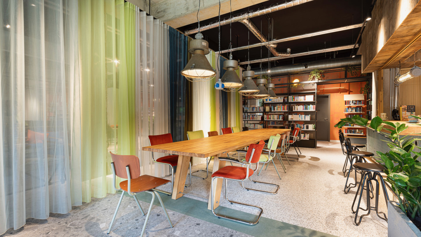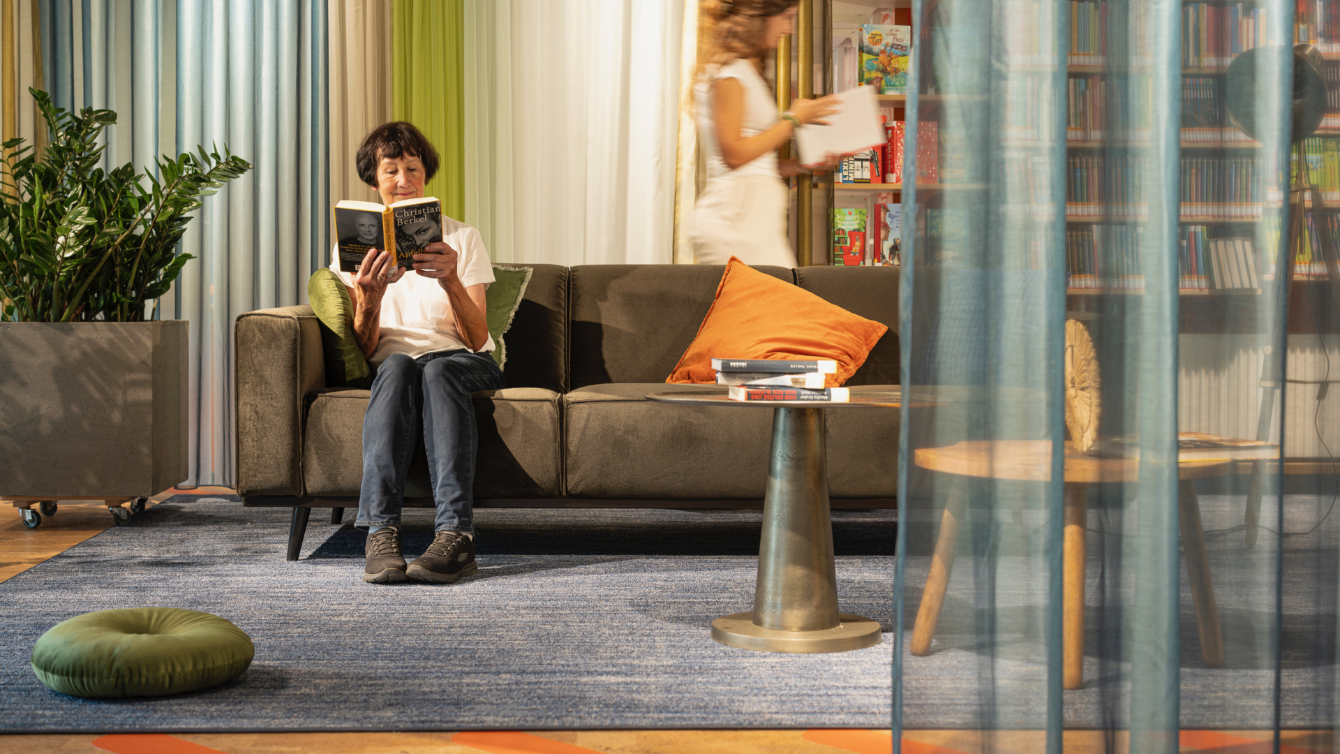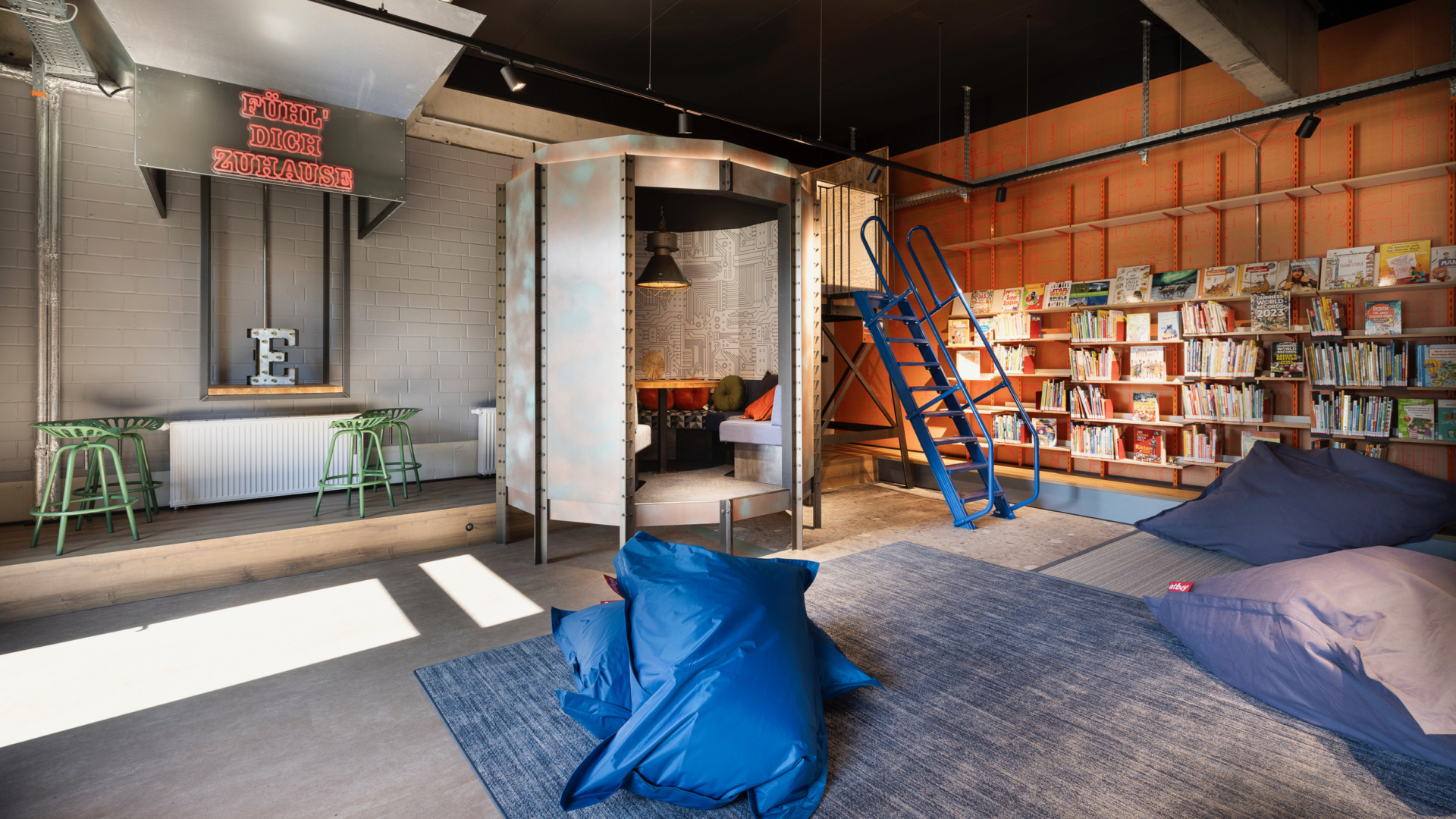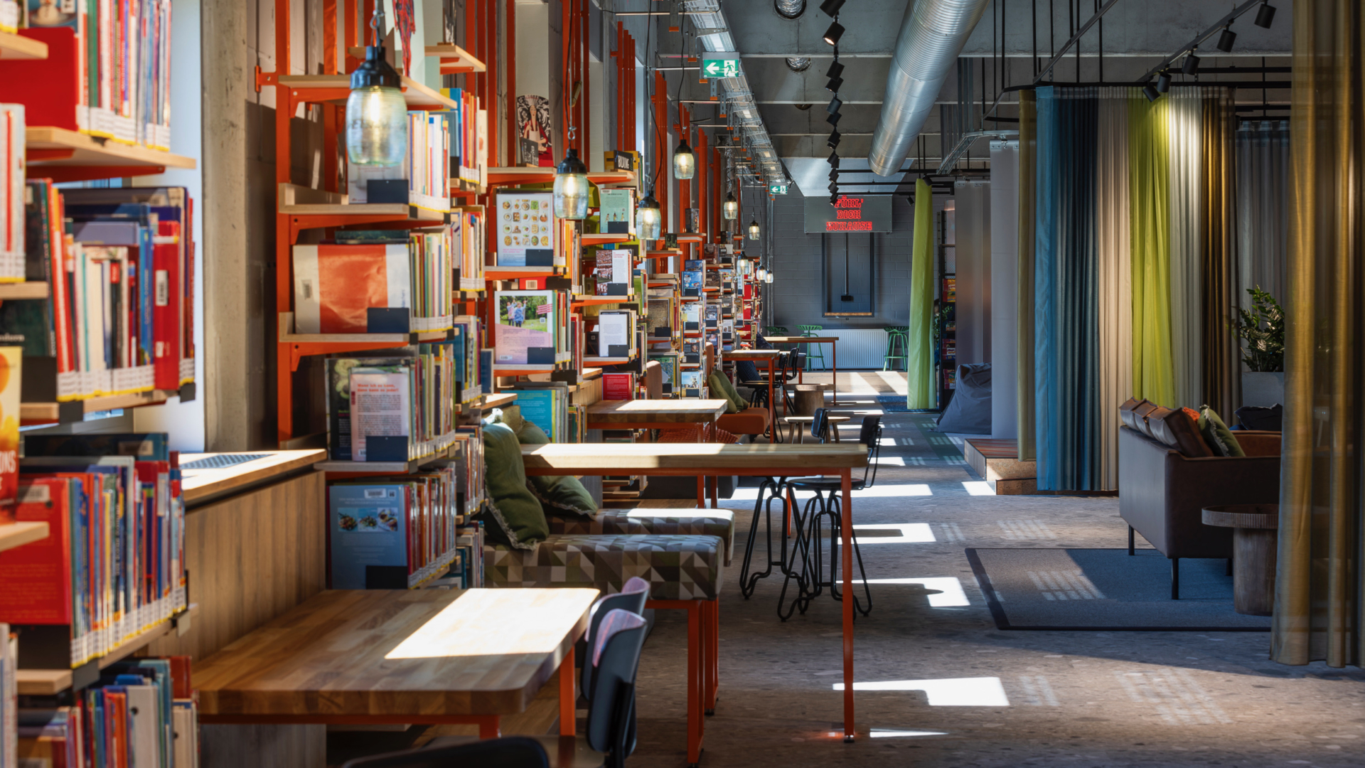 In Huttrop District Library, the industrial past comes to life in a modern way via a colorful interior, where both subtle and striking references to the steel and coal industries can be discovered. This creates recognition, a familiar feeling, but also wonder. Upon entering, everyone immediately feels welcome in the cozy coffee bar with the infotheque. Clever layouts create separate zones for different age groups and interests, each equipped with comfortable seating areas, from community tables to comfy cocoons.